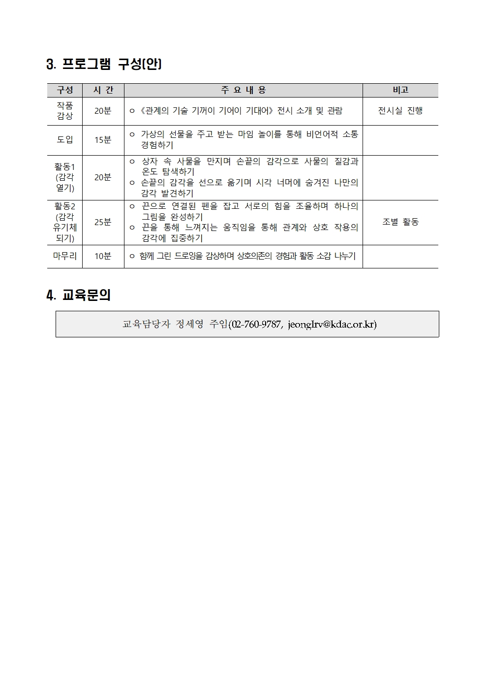 2026 모두공감기획전 전시연계 교육프로그램 〈비틀비틀 춤추는 드로잉〉 참가 신청 안내 2026-03-04 붙임1._비틀비틀_춤추는_드로잉_참가_신청_안내.hwp 붙임2._비틀비틀_춤추는_드로잉_계획(안).hwp 붙임3._모두미술공간_전시연계_교육프로그램_참가신청서_양식.hwpx 목록
