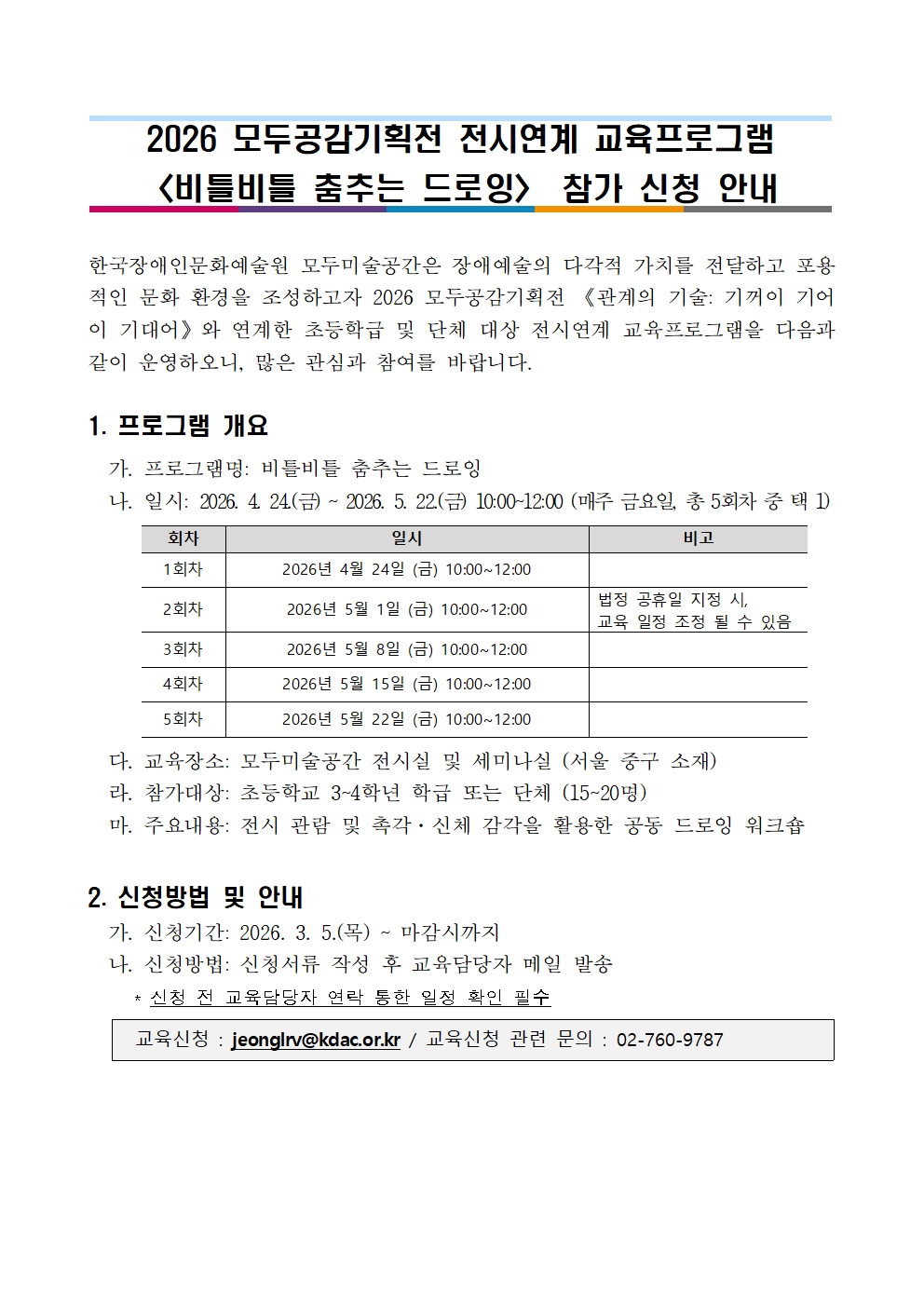 2026 모두공감기획전 전시연계 교육프로그램 〈비틀비틀 춤추는 드로잉〉 참가 신청 안내 2026-03-04 붙임1._비틀비틀_춤추는_드로잉_참가_신청_안내.hwp 붙임2._비틀비틀_춤추는_드로잉_계획(안).hwp 붙임3._모두미술공간_전시연계_교육프로그램_참가신청서_양식.hwpx 목록